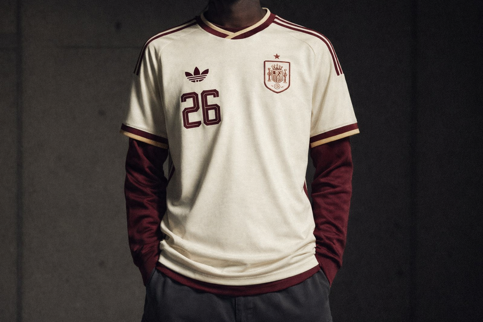 Camisa masculina reserva da Espanha 26-27, inspirada no uniforme away para a Copa do Mundo 2026. O modelo apresenta cor off-white predominante, com detalhes em grená e dourado na gola e nos punhos. O corpo traz padrão gráfico sutil em relevo, criando um visual elegante, moderno e alternativo, ideal para torcer, colecionar ou usar no dia a dia esportivo.